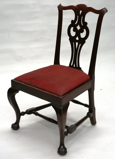 Description: Having a carved serpentine crest rail over a pierced "owl's eye" splat and trapezoidal seat with loose upholstered seat frame on cabriole legs with pad feet connected by turned stretchers.